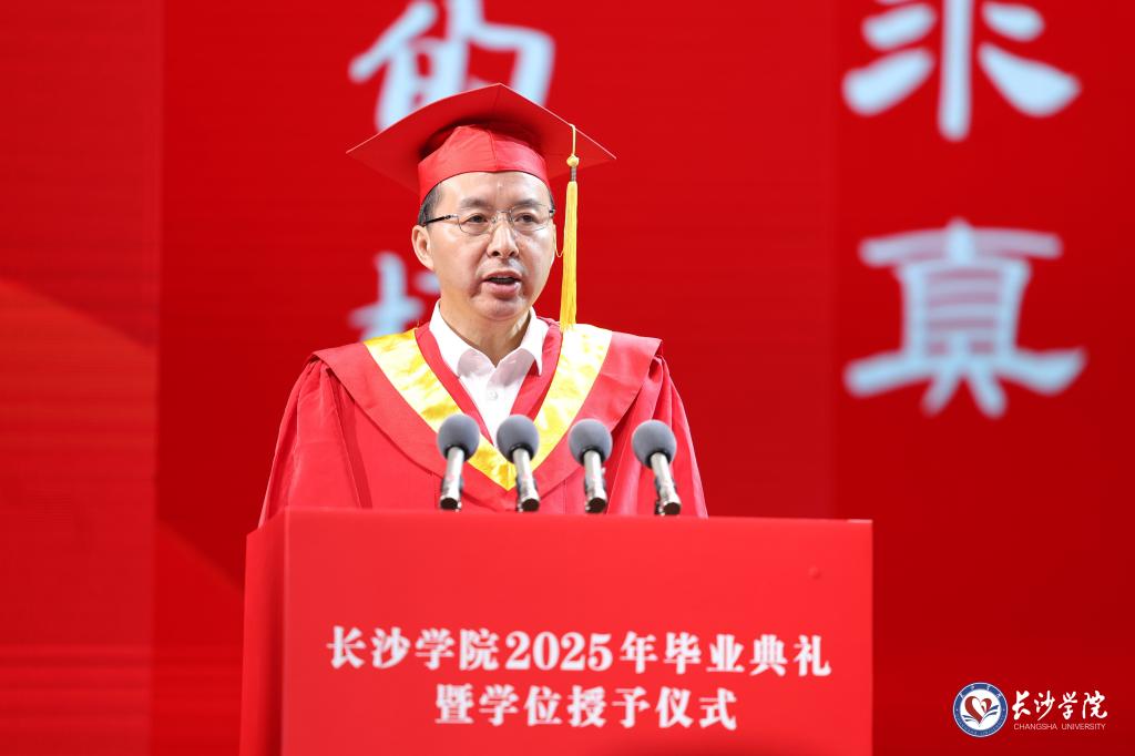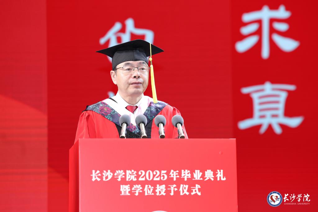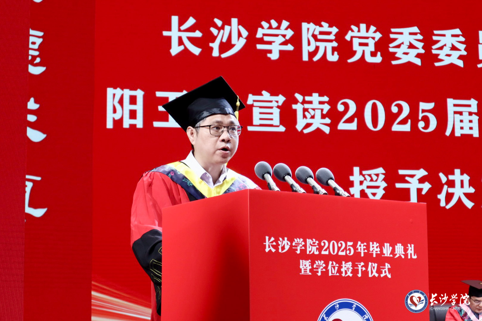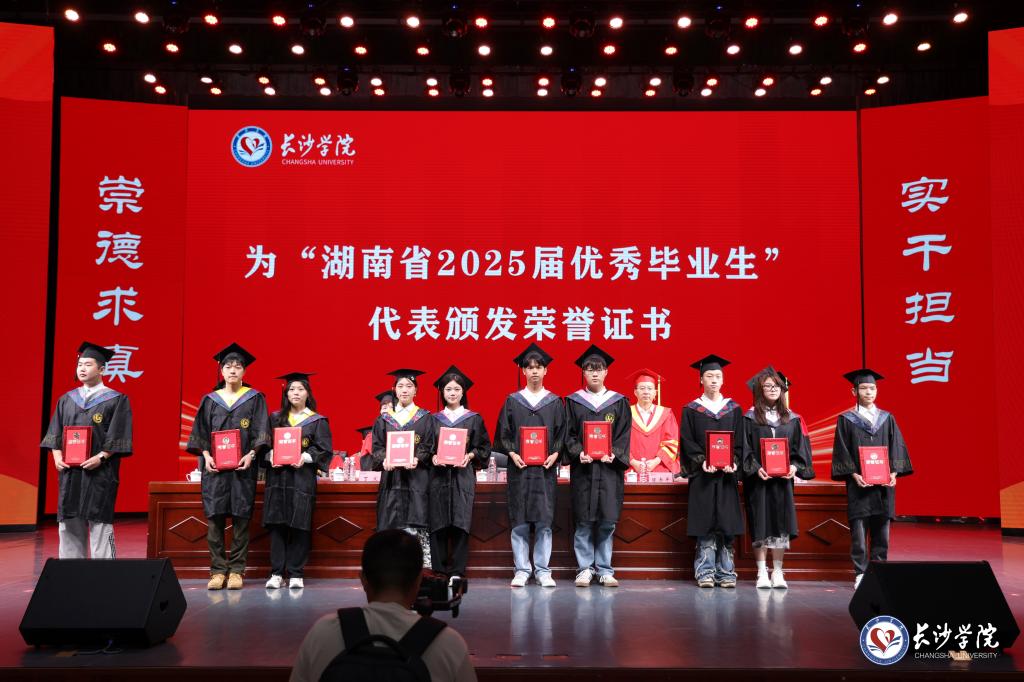 党委委员、副校长阳王东宣读了《长沙学院学位评定委员会关于授予2025年学士学位的决定》。党委委员、纪委书记丁文宣读了省级、校级优秀毕业生表彰文件。校领导依次为学校“湖南省2025届优秀毕业生”代表颁发荣誉证书。