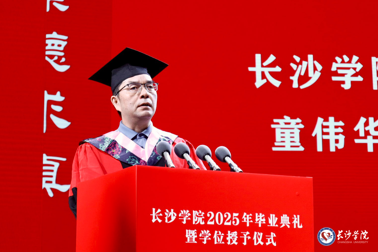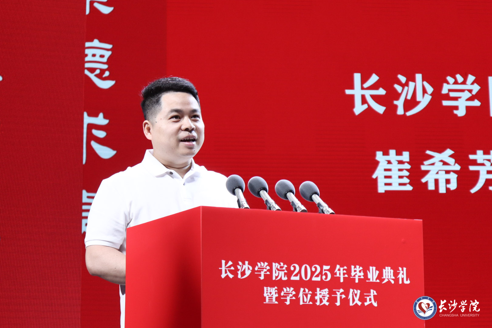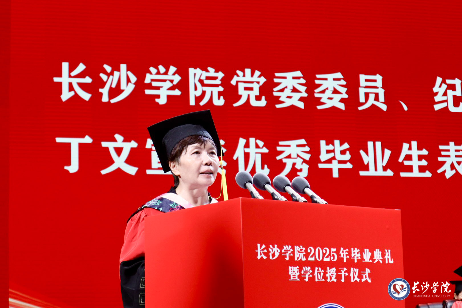 党委委员、副校长阳王东宣读了《长沙学院学位评定委员会关于授予2025年学士学位的决定》。党委委员、纪委书记丁文宣读了省级、校级优秀毕业生表彰文件。校领导依次为学校“湖南省2025届优秀毕业生”代表颁发荣誉证书。